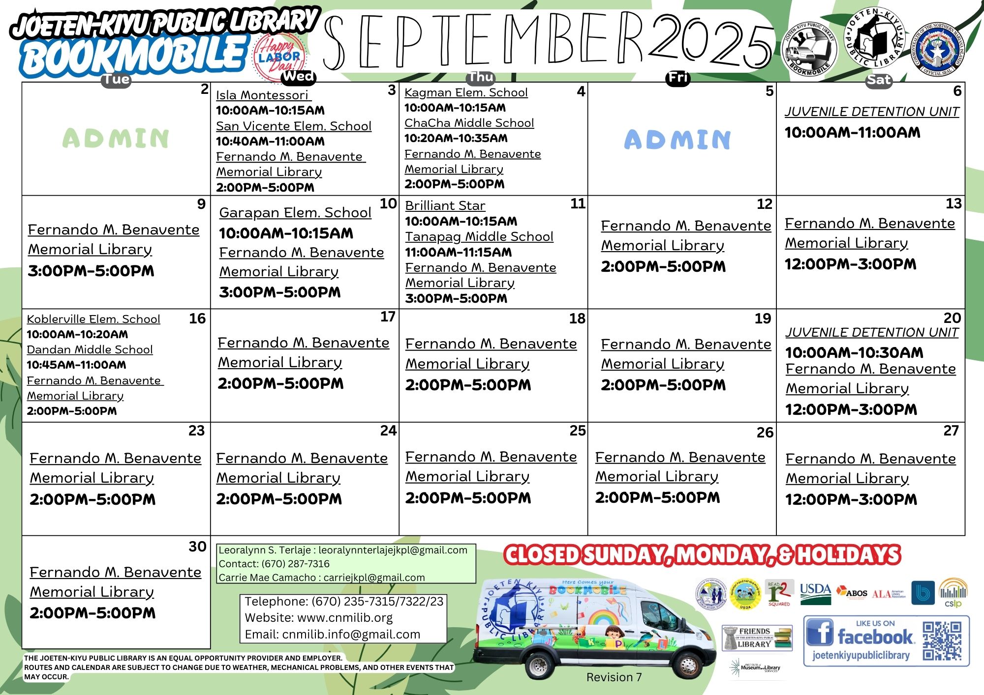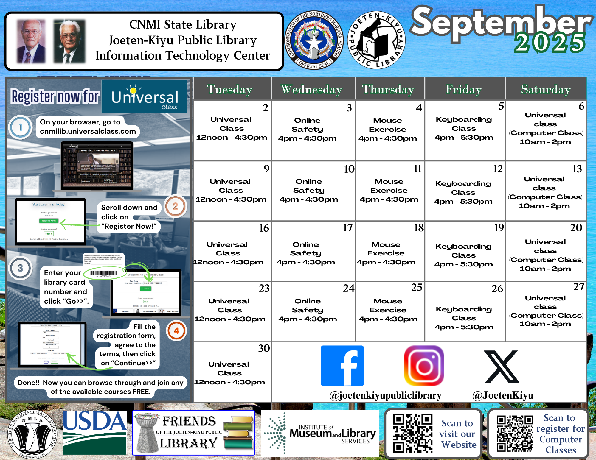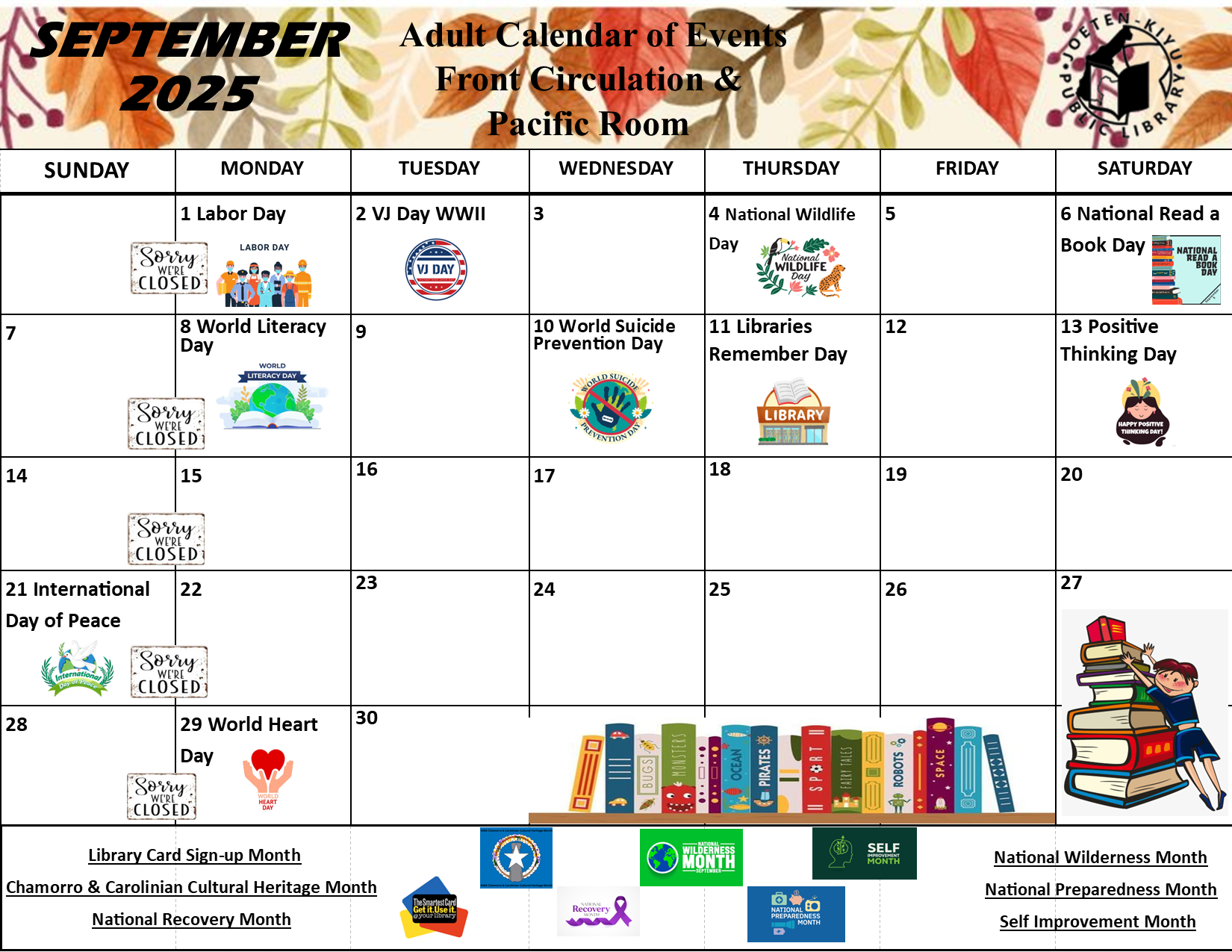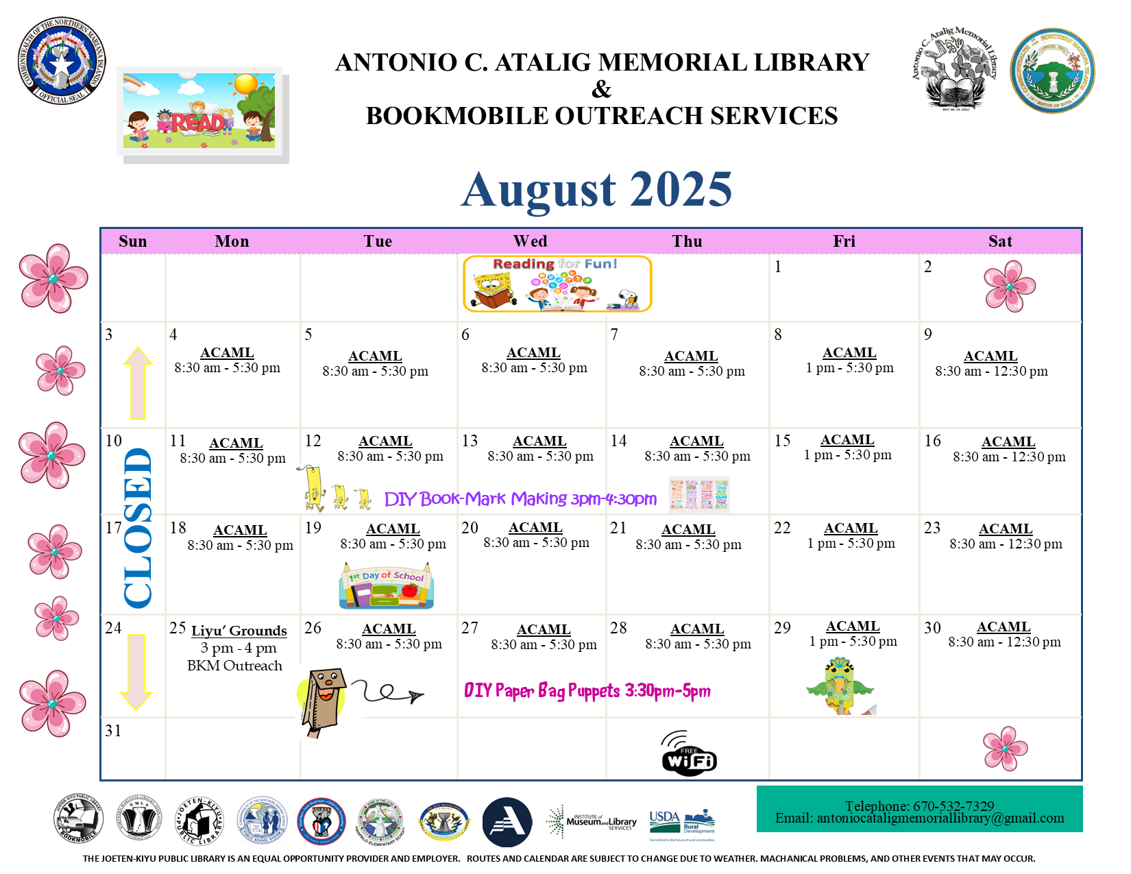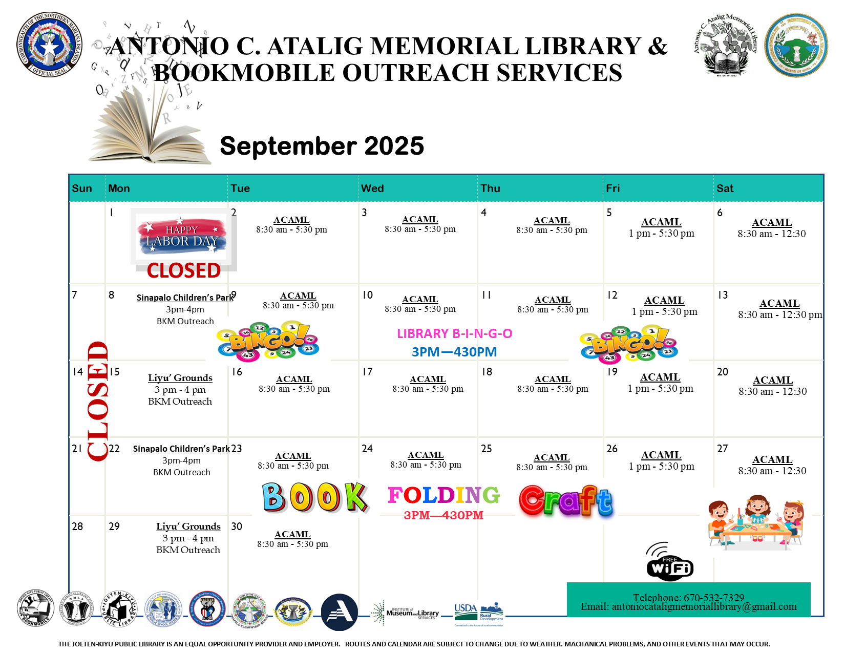 Posted on August 30, 2025September 16, 2025September 2025 Calendar of Events Children's Library Front Circulation Information Technology Center Bookmobile Outreach Services Antonio C. Atalig Memorial Library