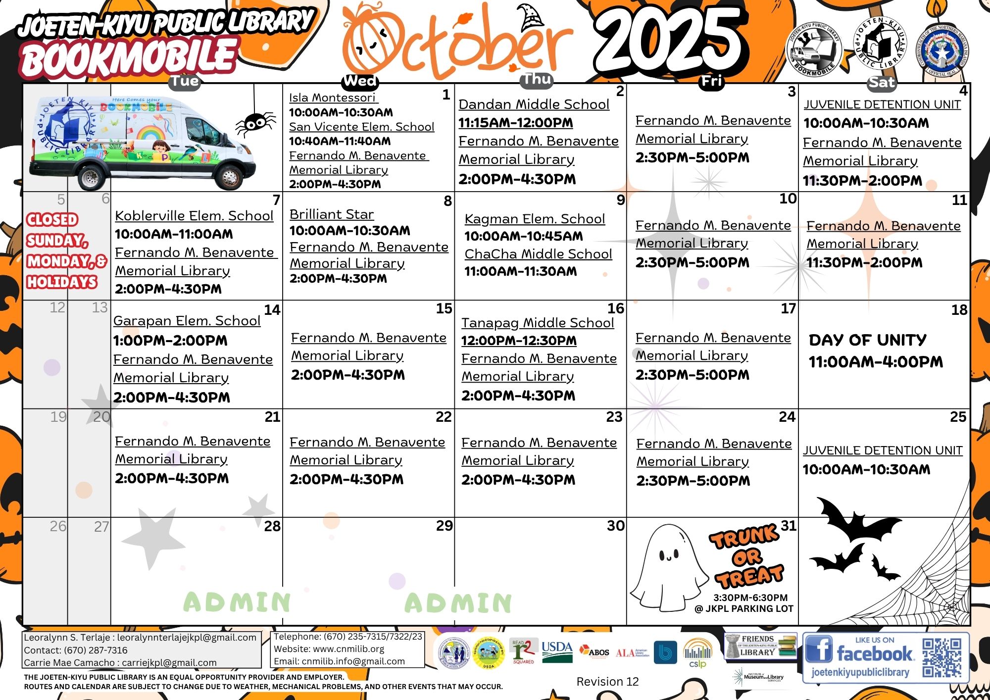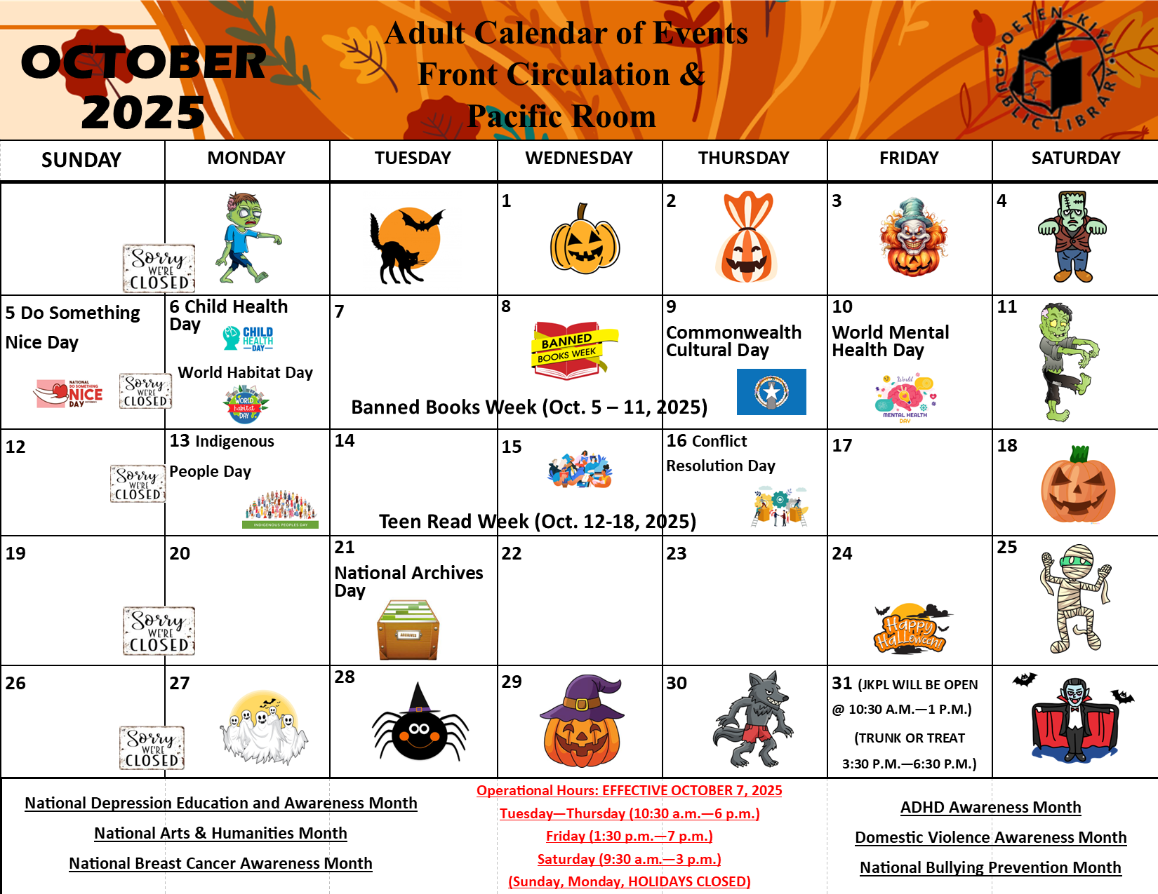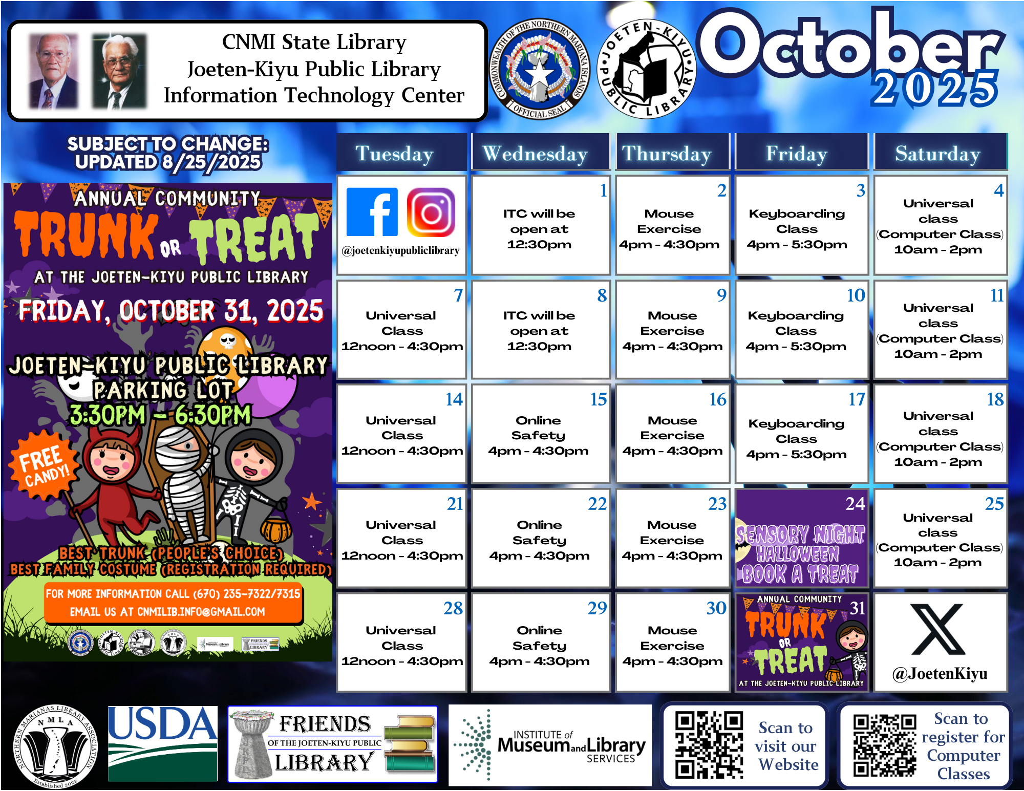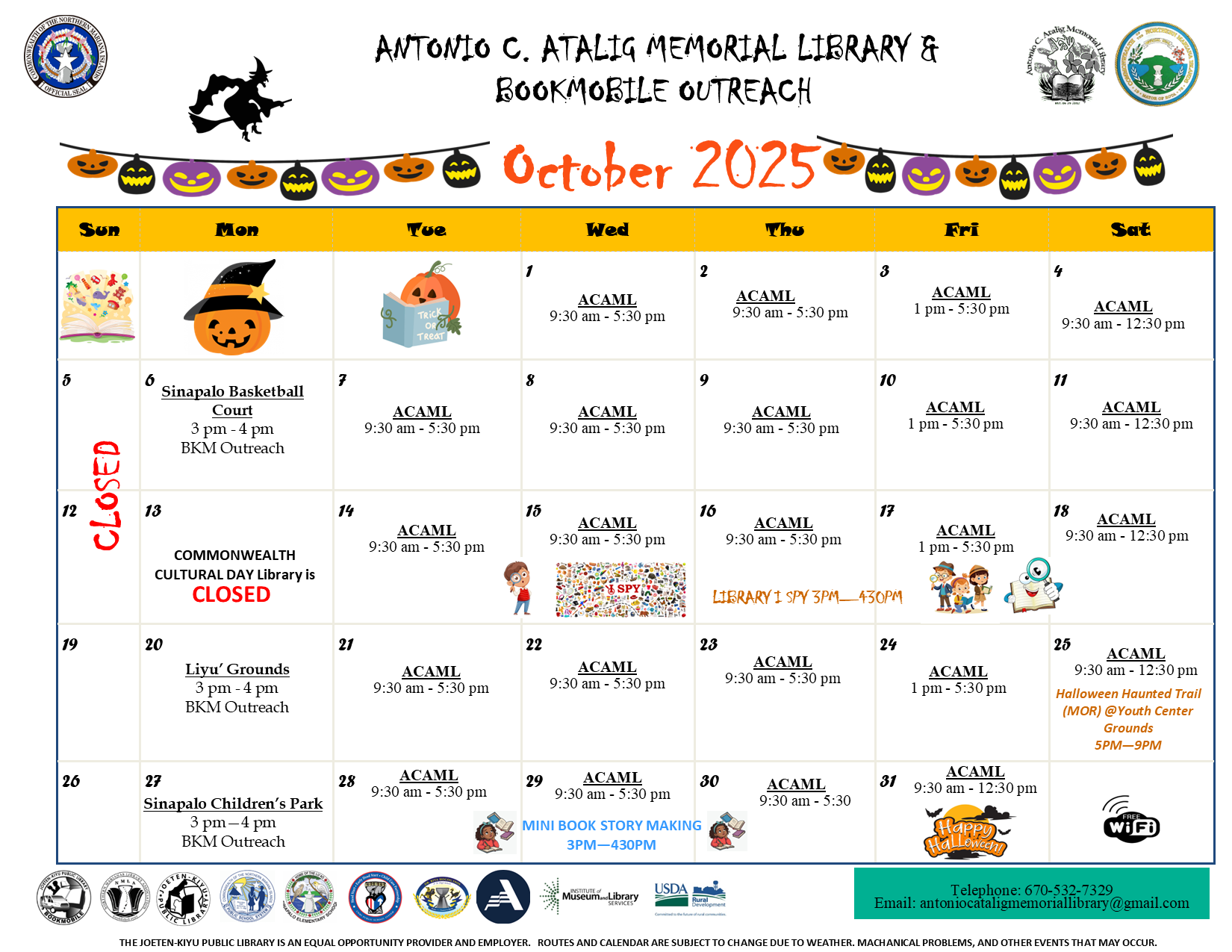 Posted on October 3, 2025October 14, 2025October 2025 Calendar of Events Children's Library Front Circulation Information Technology Center Bookmobile Outreach Services Antonio C. Atalig Memorial Library