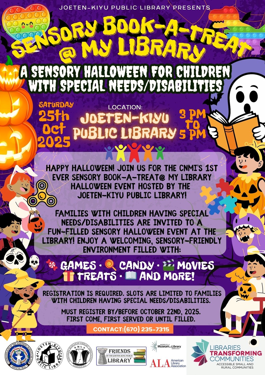 Saipan, CNMI – Happy Halloween! The Joeten-Kiyu Public Library is thrilled to host the CNMI’s first ever Sensory Book-a-Treat@ My Library Halloween event for families with children having special needs/disabilities!