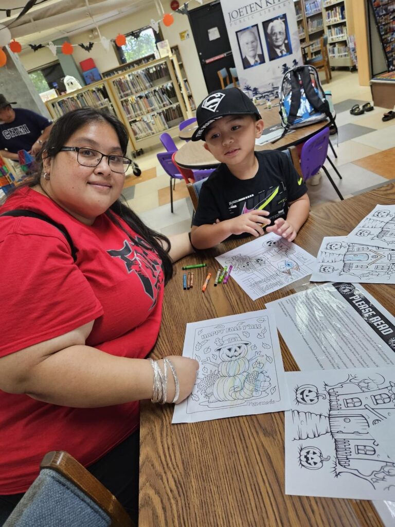 Designed especially for families with children with disabilities and special needs, the event transformed the Joeten-Kiyu Public Library into a mini-indoor carnival complete with seven themed library activity trick or treating stations, games, sensory-friendly giveaways, and a festive Halloween movie screening. Families participated in a variety of fun games and activities, including inflatables, cornhole, Knock ‘Em Down, Big Stack Tetris, Plinko, coloring stations, and arts & crafts. The program provided a joyful and safe alternative to traditional Halloween celebrations, offering children the opportunity to explore, play, and connect in a welcoming and sensory-sensitive environment.